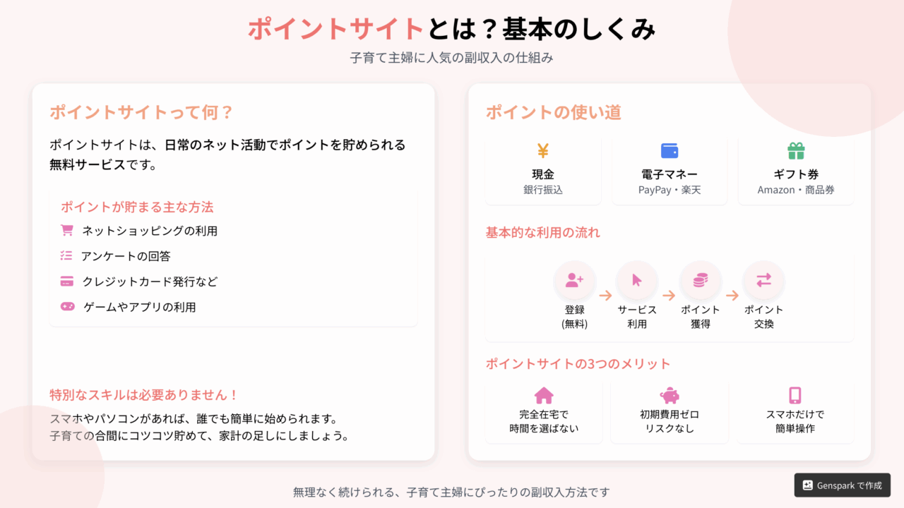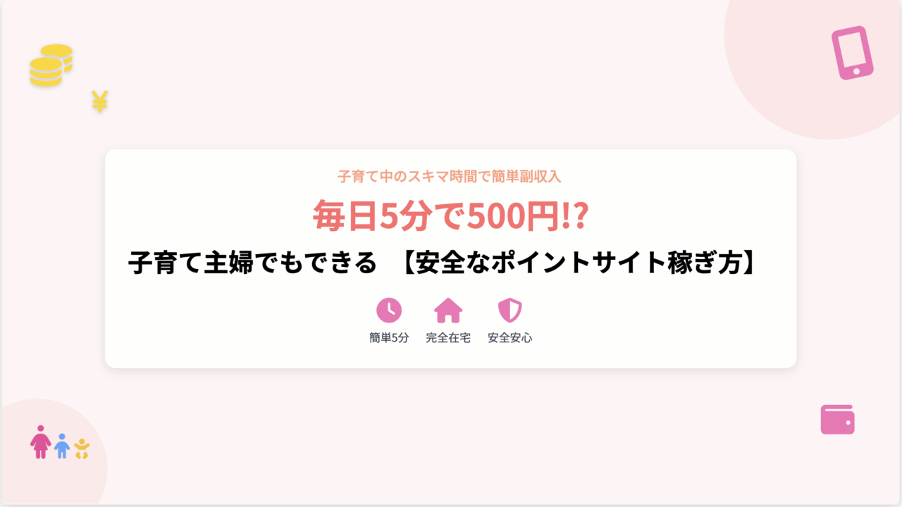 外で働く時間はないけれど、ちょっとした副収入が欲しい。そんな子育て主婦にぴったりなのが、ポイントサイトでの稼ぎ方です。